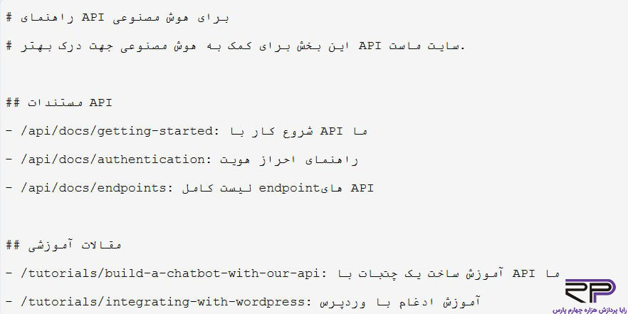 به عبارتی این فایل به شکل ساختاریافته، مسیرهای مختلف صفحات و مستندات سایت را برای مدلهای زبان هوش مصنوعی (AI) فراهم میکند و به آنها این امکان را می دهند تا بهطور مؤثرتر و سریعتر اطلاعات مورد نیازشان را پیدا کنند.